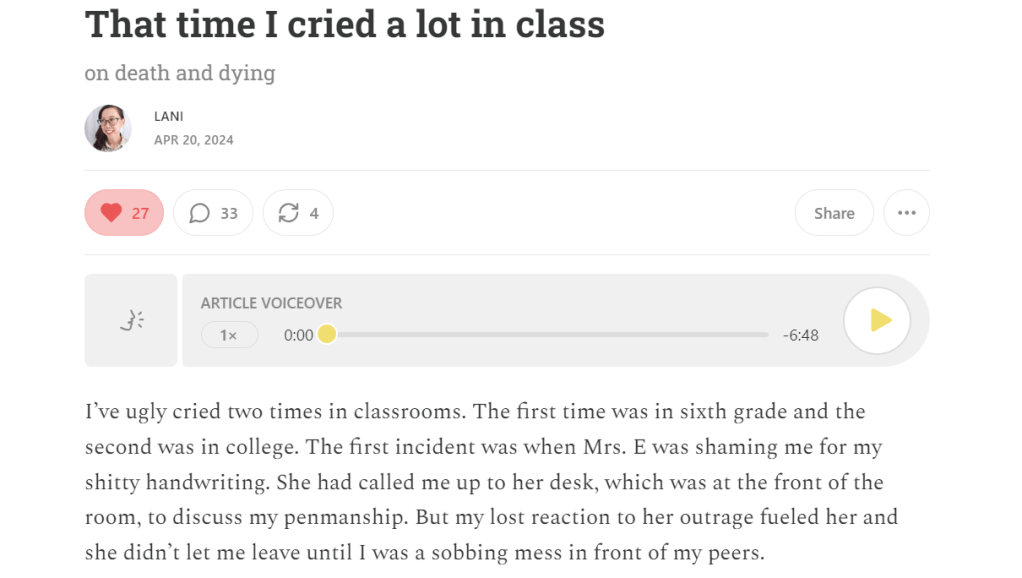 Another essay that I’m happy with is That time I cried a lot in class because I took a new look at something that had happened and realized how much it changed my fears towards death.